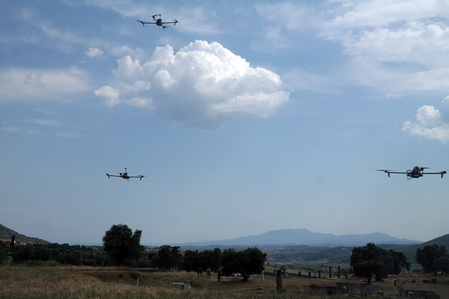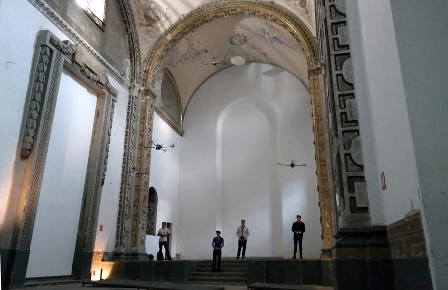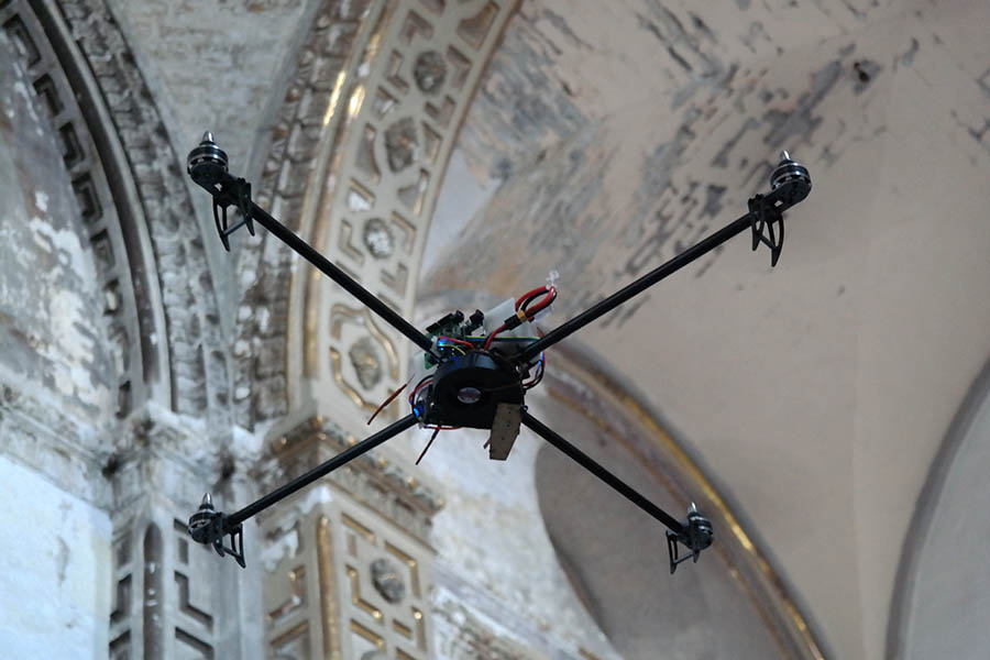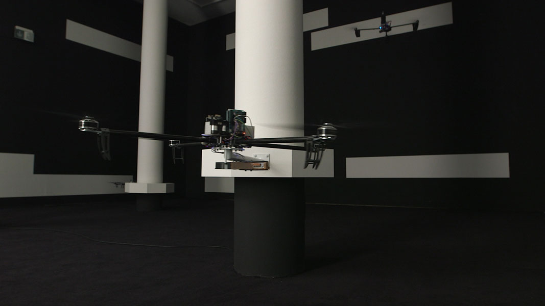 TETRAKTYS is generated with the aid of aerial drones, which form the corners of a virtual tetrahedron in space, function as sound generators of a mechanical model of the sky. Each drone is equipped with a singular accordion tongue permanently exited by a fan. All together the four drones form a simple chord structure, based on fifths. They create a hovering sound space. As humming "spheres" they accompany the changing spatial constellations of their "celestial bodies" and other interferences such as airflow and resonances.